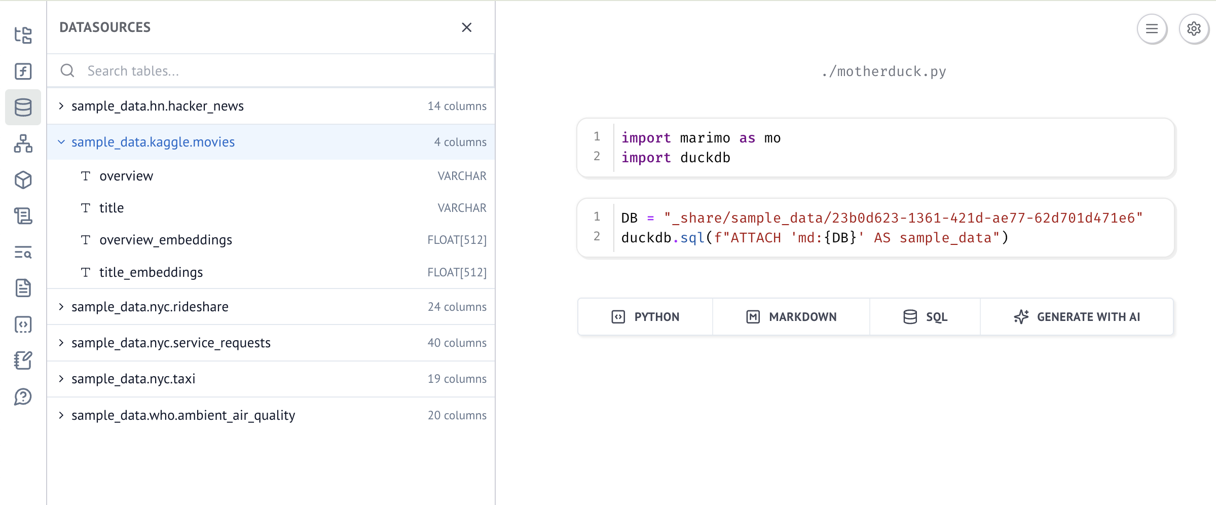 For a full example of using MotherDuck with marimo, check out our MotherDuck example notebook.