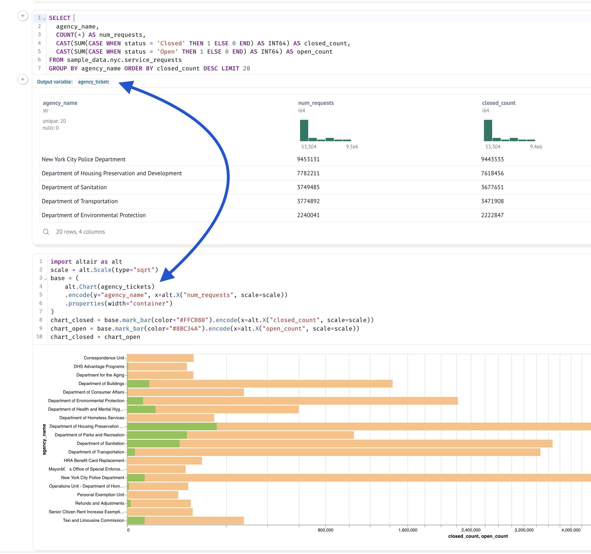 This example demonstrates how you can use SQL to query your data, then use Python and marimo to further analyze and visualize the results.