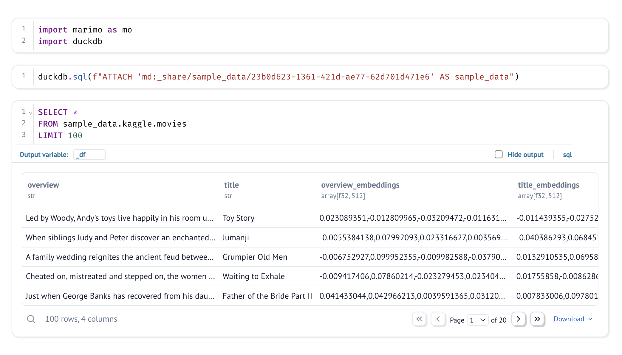 You can query your MotherDuck tables using SQL cells in marimo. Here's an example of how to query a table and display the results using marimo: